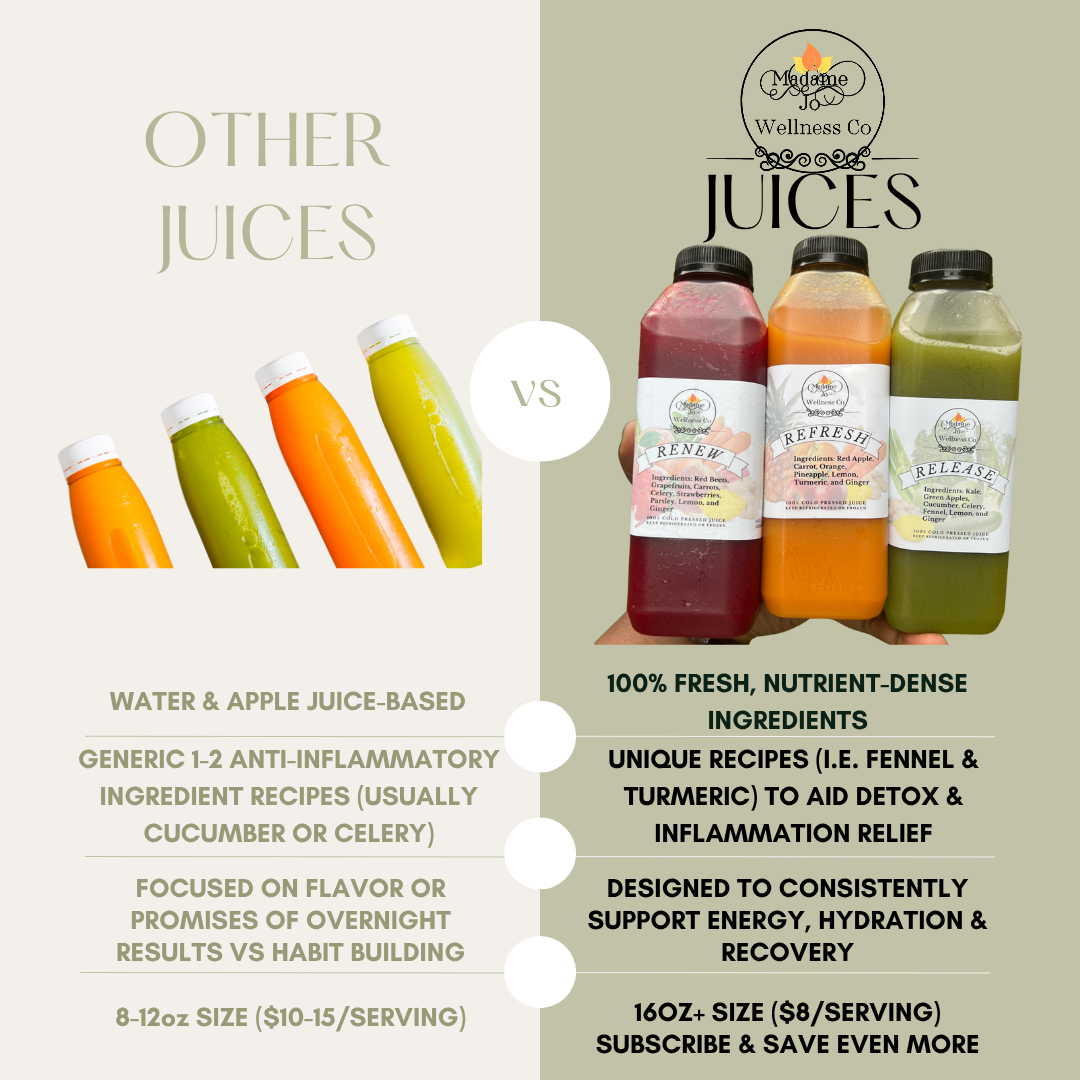 Refresh - the perfect blend of Fuji apples, carrots, oranges, pineapples, lemon, turmeric, and ginger. Packed with Vitamin C and antioxidants, this juice is the perfect way to start your day or give your body a midday boost.